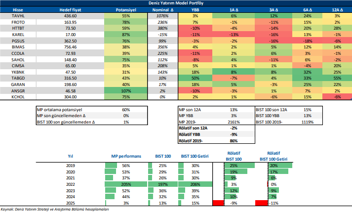 Deniz Yatırım Model Portföy, Deniz Yatırım Strateji ve Araştırma Bölümü tarafından, temel analiz kriterlerine göre hazırlanmış, orta-uzun vadeli hisse senedi tavsiye listesidir. Alınan pozisyonlar sadece uzun yönlüdür (long only). Herhangi bir rakamsal/yüzdesel getiri hedefi söz konusu değildir. Herhangi bir şirket sayısı sınırı söz konusu değildir. Herhangi bir sıklıkta/takvim dahilinde değişiklik yapma zorunluluğu söz konusu değildir. Strateji ve Araştırma Bölümü analistleri portföyü takvim yılı içerisinde piyasa koşulları izin vermez ise değiştirmeme hakkına sahiptirler. Portföy içerisinde yer alan şirketler için temel analiz açısından getiri potansiyeli kalmamış dahi olsa da (değerleme olarak) şirket markasına olan geçmiş ve gelecek dönem güveni ile liste içerisinde kalmaya devam edebilirler. Portföyde yer alan şirketler için AL tavsiyesi bulunması zorunluluğu söz konusu değildir. Bölüm analistleri, TUT ve/veya Gözden Geçiriliyor önerileri ile de liste içerisinde şirket tercihinde bulunabilirler.