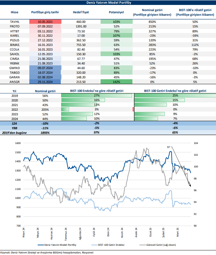 Deniz Yatırım Model Portföy, Deniz Yatırım Strateji ve Araştırma Bölümü tarafından, temel analiz kriterlerine göre hazırlanmış, orta-uzun vadeli hisse senedi tavsiye listesidir. Alınan pozisyonlar sadece uzun yönlüdür (long only). Herhangi bir rakamsal/yüzdesel getiri hedefi söz konusu değildir. Herhangi bir şirket sayısı sınırı söz konusu değildir. Herhangi bir sıklıkta/takvim dahilinde değişiklik yapma zorunluluğu söz konusu değildir. Strateji ve Araştırma Bölümü analistleri portföyü takvim yılı içerisinde piyasa koşulları izin vermez ise değiştirmeme hakkına sahiptirler. Portföy içerisinde yer alan şirketler için temel analiz açısından getiri potansiyeli kalmamış dahi olsa da (değerleme olarak) şirket markasına olan geçmiş ve gelecek dönem güveni ile liste içerisinde kalmaya devam edebilirler. Portföyde yer alan şirketler için AL tavsiyesi bulunması zorunluluğu söz konusu değildir. Bölüm analistleri, TUT ve/veya Gözden Geçiriliyor önerileri ile de liste içerisinde şirket tercihinde bulunabilirler.