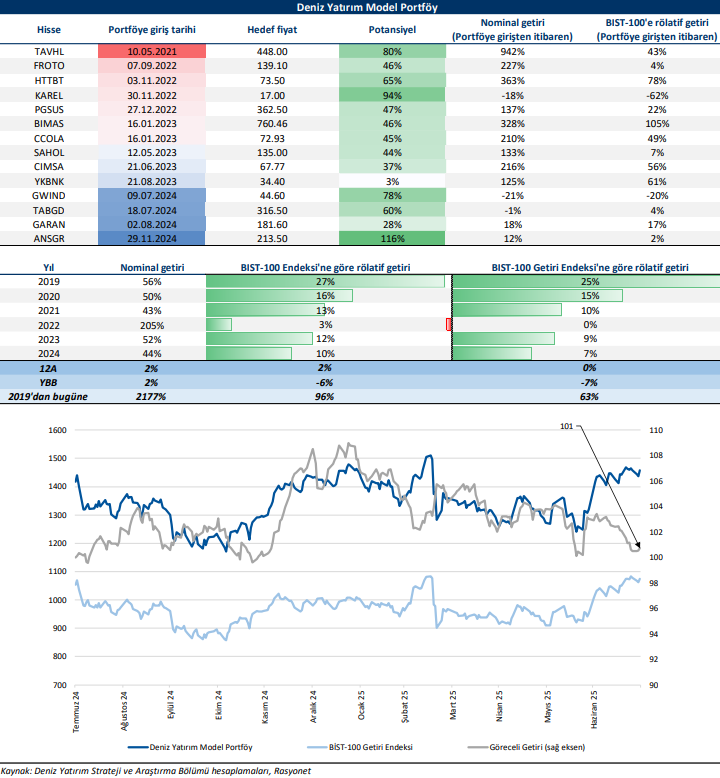 Deniz Yatırım Model Portföy, Deniz Yatırım Strateji ve Araştırma Bölümü tarafından, temel analiz kriterlerine göre hazırlanmış, orta-uzun vadeli hisse senedi tavsiye listesidir. Alınan pozisyonlar sadece uzun yönlüdür (long only). Herhangi bir rakamsal/yüzdesel getiri hedefi söz konusu değildir. Herhangi bir şirket sayısı sınırı söz konusu değildir. Herhangi bir sıklıkta/takvim dahilinde değişiklik yapma zorunluluğu söz konusu değildir. Strateji ve Araştırma Bölümü analistleri portföyü takvim yılı içerisinde piyasa koşulları izin vermez ise değiştirmeme hakkına sahiptirler. Portföy içerisinde yer alan şirketler için temel analiz açısından getiri potansiyeli kalmamış dahi olsa da (değerleme olarak) şirket markasına olan geçmiş ve gelecek dönem güveni ile liste içerisinde kalmaya devam edebilirler. Portföyde yer alan şirketler için AL tavsiyesi bulunması zorunluluğu söz konusu değildir. Bölüm analistleri, TUT ve/veya Gözden Geçiriliyor önerileri ile de liste içerisinde şirket tercihinde bulunabilirler.
