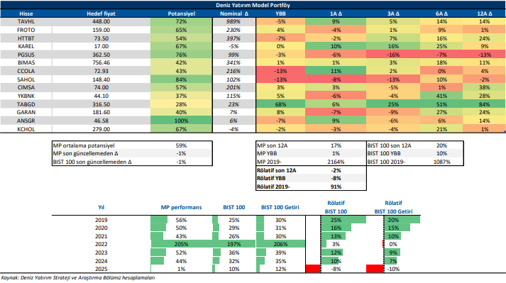 Deniz Yatırım Model Portföy, Deniz Yatırım Strateji ve Araştırma Bölümü tarafından, temel analiz kriterlerine göre hazırlanmış, orta-uzun vadeli hisse senedi tavsiye listesidir. Alınan pozisyonlar sadece uzun yönlüdür (long only). Herhangi bir rakamsal/yüzdesel getiri hedefi söz konusu değildir. Herhangi bir şirket sayısı sınırı söz konusu değildir. Herhangi bir sıklıkta/takvim dahilinde değişiklik yapma zorunluluğu söz konusu değildir. Strateji ve Araştırma Bölümü analistleri portföyü takvim yılı içerisinde piyasa koşulları izin vermez ise değiştirmeme hakkına sahiptirler. Portföy içerisinde yer alan şirketler için temel analiz açısından getiri potansiyeli kalmamış dahi olsa da (değerleme olarak) şirket markasına olan geçmiş ve gelecek dönem güveni ile liste içerisinde kalmaya devam edebilirler. Portföyde yer alan şirketler için AL tavsiyesi bulunması zorunluluğu söz konusu değildir. Bölüm analistleri, TUT ve/veya Gözden Geçiriliyor önerileri ile de liste içerisinde şirket tercihinde bulunabilirler.