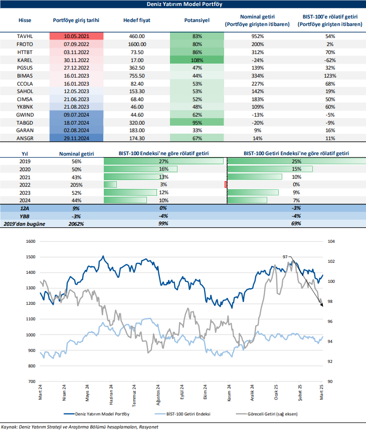 Deniz Yatırım Model Portföy, Deniz Yatırım Strateji ve Araştırma Bölümü tarafından, temel analiz kriterlerine göre hazırlanmış, orta-uzun vadeli hisse senedi tavsiye listesidir. Alınan pozisyonlar sadece uzun yönlüdür (long only). Herhangi bir rakamsal/yüzdesel getiri hedefi söz konusu değildir. Herhangi bir şirket sayısı sınırı söz konusu değildir. Herhangi bir sıklıkta/takvim dahilinde değişiklik yapma zorunluluğu söz konusu değildir. Strateji ve Araştırma Bölümü analistleri portföyü takvim yılı içerisinde piyasa koşulları izin vermez ise değiştirmeme hakkına sahiptirler. Portföy içerisinde yer alan şirketler için temel analiz açısından getiri potansiyeli kalmamış dahi olsa da (değerleme olarak) şirket markasına olan geçmiş ve gelecek dönem güveni ile liste içerisinde kalmaya devam edebilirler. Portföyde yer alan şirketler için AL tavsiyesi bulunması zorunluluğu söz konusu değildir. Bölüm analistleri, TUT ve/veya Gözden Geçiriliyor önerileri ile de liste içerisinde şirket tercihinde bulunabilirler.