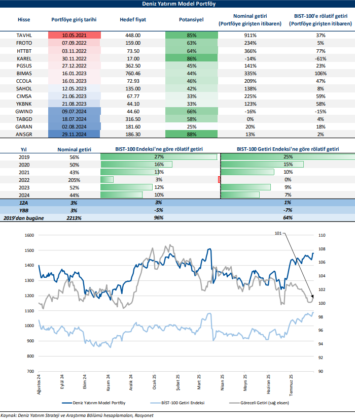 Deniz Yatırım Model Portföy, Deniz Yatırım Strateji ve Araştırma Bölümü tarafından, temel analiz kriterlerine göre hazırlanmış, orta-uzun vadeli hisse senedi tavsiye listesidir. Alınan pozisyonlar sadece uzun yönlüdür (long only). Herhangi bir rakamsal/yüzdesel getiri hedefi söz konusu değildir. Herhangi bir şirket sayısı sınırı söz konusu değildir. Herhangi bir sıklıkta/takvim dahilinde değişiklik yapma zorunluluğu söz konusu değildir. Strateji ve Araştırma Bölümü analistleri portföyü takvim yılı içerisinde piyasa koşulları izin vermez ise değiştirmeme hakkına sahiptirler. Portföy içerisinde yer alan şirketler için temel analiz açısından getiri potansiyeli kalmamış dahi olsa da (değerleme olarak) şirket markasına olan geçmiş ve gelecek dönem güveni ile liste içerisinde kalmaya devam edebilirler. Portföyde yer alan şirketler için AL tavsiyesi bulunması zorunluluğu söz konusu değildir. Bölüm analistleri, TUT ve/veya Gözden Geçiriliyor önerileri ile de liste içerisinde şirket tercihinde bulunabilirler.