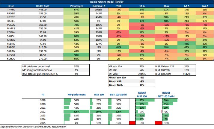 Deniz Yatırım Model Portföy, Deniz Yatırım Strateji ve Araştırma Bölümü tarafından, temel analiz kriterlerine göre hazırlanmış, orta-uzun vadeli hisse senedi tavsiye listesidir. Alınan pozisyonlar sadece uzun yönlüdür (long only). Herhangi bir rakamsal/yüzdesel getiri hedefi söz konusu değildir. Herhangi bir şirket sayısı sınırı söz konusu değildir. Herhangi bir sıklıkta/takvim dahilinde değişiklik yapma zorunluluğu söz konusu değildir. Strateji ve Araştırma Bölümü analistleri portföyü takvim yılı içerisinde piyasa koşulları izin vermez ise değiştirmeme hakkına sahiptirler. Portföy içerisinde yer alan şirketler için temel analiz açısından getiri potansiyeli kalmamış dahi olsa da (değerleme olarak) şirket markasına olan geçmiş ve gelecek dönem güveni ile liste içerisinde kalmaya devam edebilirler. Portföyde yer alan şirketler için AL tavsiyesi bulunması zorunluluğu söz konusu değildir. Bölüm analistleri, TUT ve/veya Gözden Geçiriliyor önerileri ile de liste içerisinde şirket tercihinde bulunabilirler.