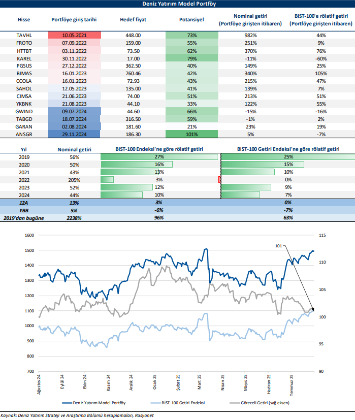 Deniz Yatırım Model Portföy, Deniz Yatırım Strateji ve Araştırma Bölümü tarafından, temel analiz kriterlerine göre hazırlanmış, orta-uzun vadeli hisse senedi tavsiye listesidir. Alınan pozisyonlar sadece uzun yönlüdür (long only). Herhangi bir rakamsal/yüzdesel getiri hedefi söz konusu değildir. Herhangi bir şirket sayısı sınırı söz konusu değildir. Herhangi bir sıklıkta/takvim dahilinde değişiklik yapma zorunluluğu söz konusu değildir. Strateji ve Araştırma Bölümü analistleri portföyü takvim yılı içerisinde piyasa koşulları izin vermez ise değiştirmeme hakkına sahiptirler. Portföy içerisinde yer alan şirketler için temel analiz açısından getiri potansiyeli kalmamış dahi olsa da (değerleme olarak) şirket markasına olan geçmiş ve gelecek dönem güveni ile liste içerisinde kalmaya devam edebilirler. Portföyde yer alan şirketler için AL tavsiyesi bulunması zorunluluğu söz konusu değildir. Bölüm analistleri, TUT ve/veya Gözden Geçiriliyor önerileri ile de liste içerisinde şirket tercihinde bulunabilirler.