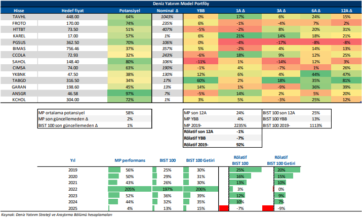 Deniz Yatırım Model Portföy, Deniz Yatırım Strateji ve Araştırma Bölümü tarafından, temel analiz kriterlerine göre hazırlanmış, orta-uzun vadeli hisse senedi tavsiye listesidir. Alınan pozisyonlar sadece uzun yönlüdür (long only). Herhangi bir rakamsal/yüzdesel getiri hedefi söz konusu değildir. Herhangi bir şirket sayısı sınırı söz konusu değildir. Herhangi bir sıklıkta/takvim dahilinde değişiklik yapma zorunluluğu söz konusu değildir. Strateji ve Araştırma Bölümü analistleri portföyü takvim yılı içerisinde piyasa koşulları izin vermez ise değiştirmeme hakkına sahiptirler. Portföy içerisinde yer alan şirketler için temel analiz açısından getiri potansiyeli kalmamış dahi olsa da (değerleme olarak) şirket markasına olan geçmiş ve gelecek dönem güveni ile liste içerisinde kalmaya devam edebilirler. Portföyde yer alan şirketler için AL tavsiyesi bulunması zorunluluğu söz konusu değildir. Bölüm analistleri, TUT ve/veya Gözden Geçiriliyor önerileri ile de liste içerisinde şirket tercihinde bulunabilirler.