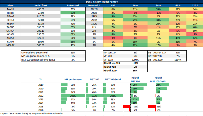 Deniz Yatırım Model Portföy, Deniz Yatırım Strateji ve Araştırma Bölümü tarafından, temel analiz kriterlerine göre hazırlanmış, orta-uzun vadeli hisse senedi tavsiye listesidir. Alınan pozisyonlar sadece uzun yönlüdür (long only). Herhangi bir rakamsal/yüzdesel getiri hedefi söz konusu değildir. Herhangi bir şirket sayısı sınırı söz konusu değildir. Herhangi bir sıklıkta/takvim dahilinde değişiklik yapma zorunluluğu söz konusu değildir. Strateji ve Araştırma Bölümü analistleri portföyü takvim yılı içerisinde piyasa koşulları izin vermez ise değiştirmeme hakkına sahiptirler. Portföy içerisinde yer alan şirketler için temel analiz açısından getiri potansiyeli kalmamış dahi olsa da (değerleme olarak) şirket markasına olan geçmiş ve gelecek dönem güveni ile liste içerisinde kalmaya devam edebilirler. Portföyde yer alan şirketler için AL tavsiyesi bulunması zorunluluğu söz konusu değildir. Bölüm analistleri, TUT ve/veya Gözden Geçiriliyor önerileri ile de liste içerisinde şirket tercihinde bulunabilirler.