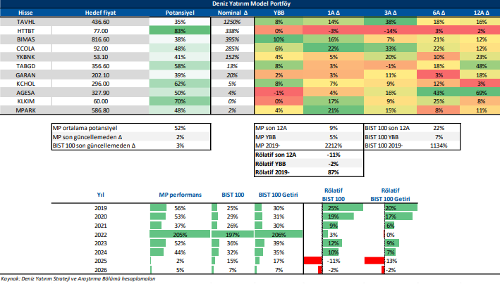 Deniz Yatırım Model Portföy, Deniz Yatırım Strateji ve Araştırma Bölümü tarafından, temel analiz kriterlerine göre hazırlanmış, orta-uzun vadeli hisse senedi tavsiye listesidir. Alınan pozisyonlar sadece uzun yönlüdür (long only). Herhangi bir rakamsal/yüzdesel getiri hedefi söz konusu değildir. Herhangi bir şirket sayısı sınırı söz konusu değildir. Herhangi bir sıklıkta/takvim dahilinde değişiklik yapma zorunluluğu söz konusu değildir. Strateji ve Araştırma Bölümü analistleri portföyü takvim yılı içerisinde piyasa koşulları izin vermez ise değiştirmeme hakkına sahiptirler. Portföy içerisinde yer alan şirketler için temel analiz açısından getiri potansiyeli kalmamış dahi olsa da (değerleme olarak) şirket markasına olan geçmiş ve gelecek dönem güveni ile liste içerisinde kalmaya devam edebilirler. Portföyde yer alan şirketler için AL tavsiyesi bulunması zorunluluğu söz konusu değildir. Bölüm analistleri, TUT ve/veya Gözden Geçiriliyor önerileri ile de liste içerisinde şirket tercihinde bulunabilirler.
