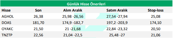 Coca-Cola ve Migros’ta güçlü nakit yaratımı nedeniyle Anadolu Holding’i, yurtiçinde yoğun rekabet ortamında marjlarını ve satışlarını artıran Doğuş Otomotiv’i, dünkü düşüşle yeniden kısa vadeli fırsat sunan Oyak Çimento’yu ve dünkü gelişmeler nedeniyle finansal sonuçlarının fiyatlamasını tam olarak yansıtamayan Tınaztepe’yi günlük hisse öneri listemize dahil ediyoruz.