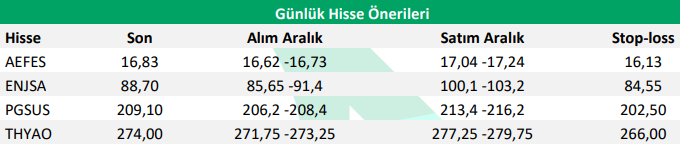 EPDK’nın belirlediği reel getiri oranındaki artış nedeniyle Enerjisa’yı, Rusya’ya S-400 iadesine ilişkin görüşmelerin Anadolu Efes’e olası olumlu yansımaları, Kasım ayı iç ve dış hat yolcu büyümesi, yüksek doluluk oranları ve euro cinsi finansal raporlama avantajı nedeniyle Pegasus’u ve Southwest Airlines ile Ocak 2026’dan itibaren transatlantik uçuşlarda ortaklığa başlanacağına yönelik haberler nedeniyle Türk Hava Yolları’nı günlük hisse önerilerimiz arasında değerlendiriyoruz.