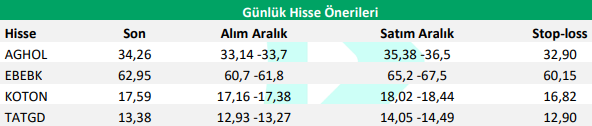 Migros ve Coco-Cola gibi bağlı ortaklarında yaşanan yükselişi nedeniyle Anadolu Grubu Holding, gıda sektöründe yaşanan yükselişin gerisinden kalan Tat Gıda ile gıda perakendesinde yükseliş sonrasında giyim perakendesinde hareketlenebileceği beklentisiyle E-bebek ve Koton’u günlük önerilerimizde yer veriyoruz.