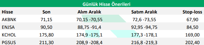 EPDK’nın belirlediği reel getiri oranındaki artış nedeniyle Enerjisa’yı, Aralık ayına ilişkin faiz indirimi beklentiler ve risk alma iştahında artış nedeniyle Akbank ve Koç Holding’i, Kasım ayı yolcu verileri ve euro cinsi finansal raporlama avantajı nedeniyle Pegasus’u günlük hisse önerilerimiz arasında yer veriyoruz.