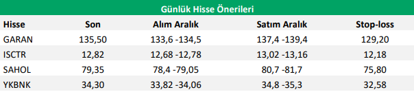 Endeksin yükselişinde banka ve holdinglerin daha ön planda olmasını bekliyoruz. Bu nedenle Garanti Bankası, Yapı Kredi Bankası ve İş Bankası’nı günlük hisse önerilerine eklerken; hem net aktif değer iskontosu hem de Akbank’ın ana hissedarı olması nedeniyle Sabancı Holding’e günlük hisse önerilerinde yer veriyoruz.