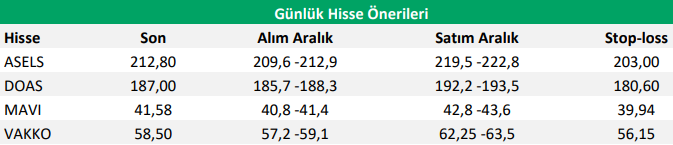 Güçlü operasyonel kârlılığını piyasa fiyatlamasına yansıtmayı başaran Mavi Giyim, satışlarını ağırlıklı olarak yıl sonunda gerçekleştiren Vakko Tekstil’i, yeni savunma sanayi siparişlerinin yanı sıra Suriye’de artan jeopolitik risklerin de desteklediği Aselsan’ı ve dünkü geri çekilmede yatay destek seviyesine gerileyen Doğuş Otomotiv’i günlük hisse önerilerimizde yer veriyoruz.