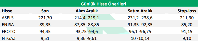 Yatırımlarını son çeyrekte ağırlıklı gerçekleşmesini beklediğimiz Enerjisa’yı, satışlarını ağırlıklı olarak yıl sonunda gerçekleştiren ve Trakyagaz’dan yeni eklediği dağıtım noktaları nedeniyle Naturel Gaz’ı, yeni savunma sanayi siparişlerinin desteği ile Aselsan’ı ve Euro dolar kurunda yükselişin olumlu yönde etkisi nedeniyle Ford Otosan’ı günlük hisse önerilerimizde yer veriyoruz.