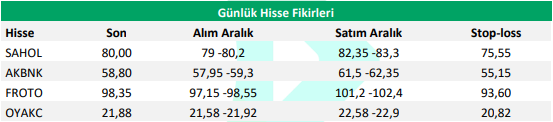 Endekse paralel bir şekilde geri çekilen ve teknik düzeltme sürecini tamamlayarak günlük grafikte destek bölgelerinde kapanış gerçekleştiren Sabancı Holding, Akbank, Ford Otosan ve Oyak Çimento’yu günlük hisse önerilerimiz arasında değerlendiriyoruz.