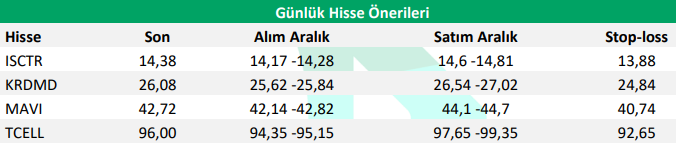 Tahvil piyasasında yaşanan ralli ve yılın son iki haftasında yaşanan yabancı alımlarının büyük ölçekli hisselere ilgiyi artırmasını bekliyoruz. Bu çerçevede, İş Bankası C’yi, endeksin gerisinde kalmış Turkcell ile Kardemir D’yi, yabancı alımlarının artığı Mavi Giyim’i günlük hisse önerilerimiz arasında yer veriyoruz.