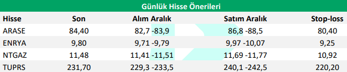 Petrol fiyatlarında yükseliş ve son beş yılın üzerinde rafineri marjını sürdüren Tüpraş’ı, Ahlatcı Altın Madenciliği’ni konsolide eden ve mevsimsellik gereği doğal gaz talebindeki artıştan olumlu etkilenen Enerya Enerji’yi, doğal gaz taşıma ve dağıtım faaliyetleri bulunan Naturel Gaz’ı ile Vangölü Enerji Yatırım’ın halka arzından benzer şirket olması nedeniyle olumlu etkilenmesini beklediğimiz Doğu Aras Enerji’yi günlük hisse önerilerimizde yer veriyoruz.