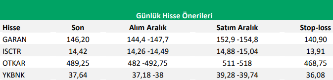 Hazine’nin başarılı gerçekleşen Eurobond ihracına gelen güçlü talep ve düşük faiz oranlarının, bankacılık sektöründe dünkü düşüşü alım fırsatına çevirebileceğini düşünüyoruz. Bu çerçevede; Garanti Bankası BBVA, İş Bankası (C) ve Yapı Kredi Bankası hisselerini önerirken, Aralık ayı OSD satış ve ihracat rakamlarını açıklayacak olan Otokar’ı da günlük hisse önerilerimiz arasında yer veriyoruz.