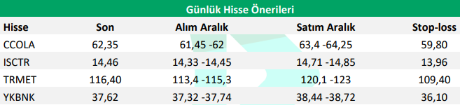 Kıymetli metallerde yaşanan yükselişin diğer endüstriyel metalleri de olumlu yönde etkilemesi nedeniyle Anadolu Metal, yabancı yatırımcıların Türkiye varlıklarına yoğun ilgisi nedeniyle Coca-Cola İçecek, İş Bankası (C) ve Yapı Kredi Bankası’nı günlük hisse önerilerimiz arasında yer veriyoruz.