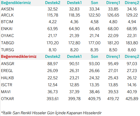 Günlük Bazda Yatırım Fikirleri’nde yer alan hisselerde günlük performans baz alındığından, yatırımcılar ilk aşamada %0.9-%2, ikinci aşamada %3.1-%4 aralıklarını pozisyon kapatma ve/veya kar alma seviyeleri olarak takip edebilirler.
