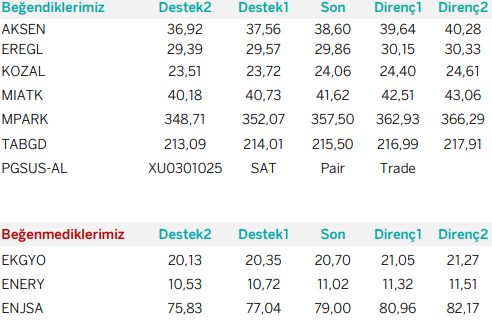 Günlük Bazda Yatırım Fikirleri’nde yer alan hisselerde günlük performans baz alındığından, yatırımcılar ilk aşamada %0.9-%2, ikinci aşamada %3.1-%4 aralıklarını pozisyon kapatma ve/veya kar alma seviyeleri olarak takip edebilirler.