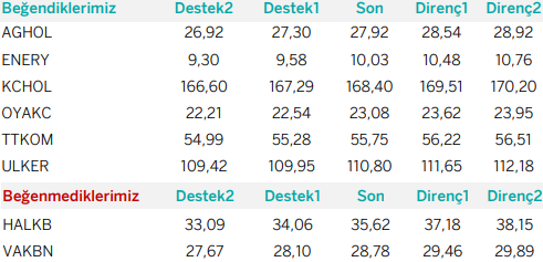 Günlük Bazda Yatırım Fikirleri’nde yer alan hisselerde günlük performans baz alındığından, yatırımcılar ilk aşamada %0.9-%2, ikinci aşamada %3.1-%4 aralıklarını pozisyon kapatma ve/veya kar alma seviyeleri olarak takip edebilirler.