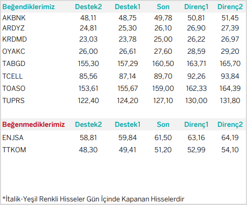 Günlük Bazda Yatırım Fikirleri’nde yer alan hisselerde günlük performans baz alındığından, yatırımcılar ilk aşamada %0.9-%2, ikinci aşamada %3.1-%4 aralıklarını pozisyon kapatma ve/veya kar alma seviyeleri olarak takip edebilirler.