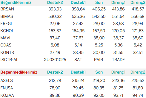 Günlük Bazda Yatırım Fikirleri’nde yer alan hisselerde günlük performans baz alındığından, yatırımcılar ilk aşamada %0.9-%2, ikinci aşamada %3.1-%4 aralıklarını pozisyon kapatma ve/veya kar alma seviyeleri olarak takip edebilirler.
