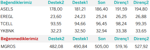 Günlük Bazda Yatırım Fikirleri’nde yer alan hisselerde günlük performans baz alındığından, yatırımcılar ilk aşamada %0.9-%2, ikinci aşamada %3.1-%4 aralıklarını pozisyon kapatma ve/veya kar alma seviyeleri olarak takip edebilirler.