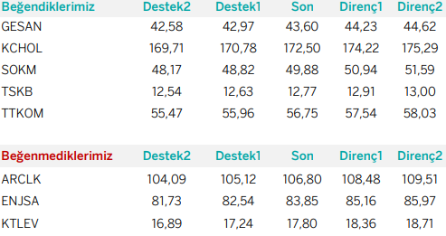 Günlük Bazda Yatırım Fikirleri’nde yer alan hisselerde günlük performans baz alındığından, yatırımcılar ilk aşamada %0.9-%2, ikinci aşamada %3.1-%4 aralıklarını pozisyon kapatma ve/veya kar alma seviyeleri olarak takip edebilirler.
