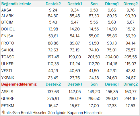 Günlük Bazda Yatırım Fikirleri’nde yer alan hisselerde günlük performans baz alındığından, yatırımcılar ilk aşamada %0.9-%2, ikinci aşamada %3.1-%4 aralıklarını pozisyon kapatma ve/veya kar alma seviyeleri olarak takip edebilirler.