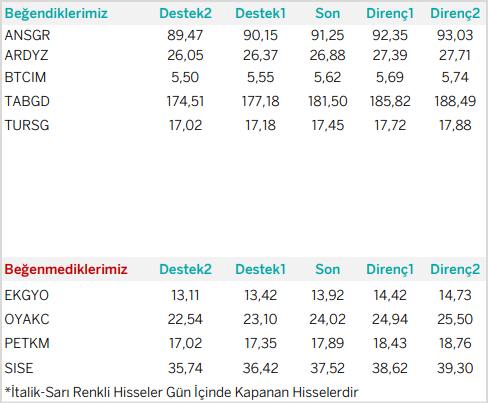 Günlük Bazda Yatırım Fikirleri’nde yer alan hisselerde günlük performans baz alındığından, yatırımcılar ilk aşamada %0.9-%2, ikinci aşamada %3.1-%4 aralıklarını pozisyon kapatma ve/veya kar alma seviyeleri olarak takip edebilirler.