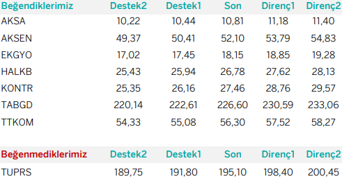 Günlük Bazda Yatırım Fikirleri’nde yer alan hisselerde günlük performans baz alındığından, yatırımcılar ilk aşamada %0.9-%2, ikinci aşamada %3.1-%4 aralıklarını pozisyon kapatma ve/veya kar alma seviyeleri olarak takip edebilirler.