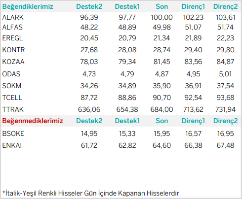Günlük Bazda Yatırım Fikirleri’nde yer alan hisselerde günlük performans baz alındığından, yatırımcılar ilk aşamada %0.9-%2, ikinci aşamada %3.1-%4 aralıklarını pozisyon kapatma ve/veya kar alma seviyeleri olarak takip edebilirler.
