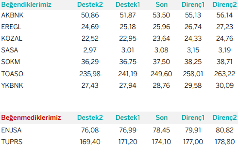 Günlük Bazda Yatırım Fikirleri’nde yer alan hisselerde günlük performans baz alındığından, yatırımcılar ilk aşamada %0.9-%2, ikinci aşamada %3.1-%4 aralıklarını pozisyon kapatma ve/veya kar alma seviyeleri olarak takip edebilirler.