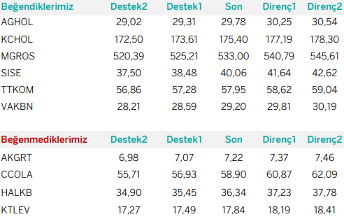 Günlük Bazda Yatırım Fikirleri’nde yer alan hisselerde günlük performans baz alındığından, yatırımcılar ilk aşamada %0.9-%2, ikinci aşamada %3.1-%4 aralıklarını pozisyon kapatma ve/veya kar alma seviyeleri olarak takip edebilirler.