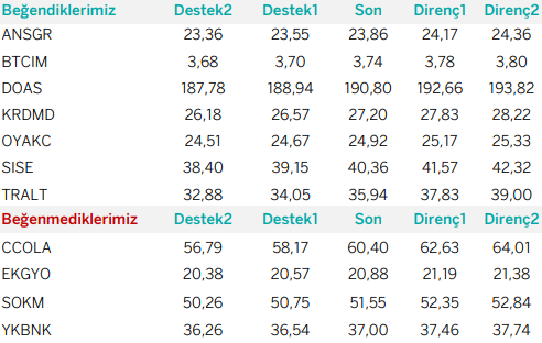 Günlük Bazda Yatırım Fikirleri’nde yer alan hisselerde günlük performans baz alındığından, yatırımcılar ilk aşamada %0.9-%2, ikinci aşamada %3.1-%4 aralıklarını pozisyon kapatma ve/veya kar alma seviyeleri olarak takip edebilirler.