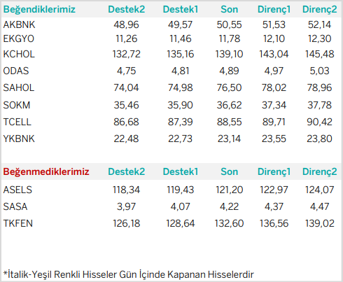 Günlük Bazda Yatırım Fikirleri’nde yer alan hisselerde günlük performans baz alındığından, yatırımcılar ilk aşamada %0.9-%2, ikinci aşamada %3.1-%4 aralıklarını pozisyon kapatma ve/veya kar alma seviyeleri olarak takip edebilirler.