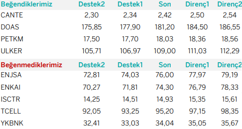Günlük Bazda Yatırım Fikirleri’nde yer alan hisselerde günlük performans baz alındığından, yatırımcılar ilk aşamada %0.9-%2, ikinci aşamada %3.1-%4 aralıklarını pozisyon kapatma ve/veya kar alma seviyeleri olarak takip edebilirler.