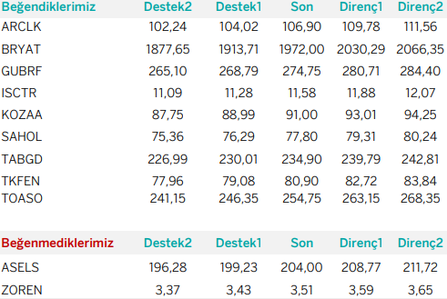 Günlük Bazda Yatırım Fikirleri’nde yer alan hisselerde günlük performans baz alındığından, yatırımcılar ilk aşamada %0.9-%2, ikinci aşamada %3.1-%4 aralıklarını pozisyon kapatma ve/veya kar alma seviyeleri olarak takip edebilirler.