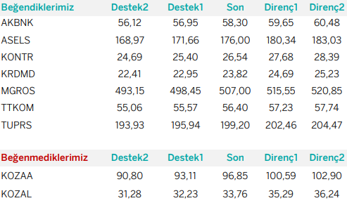 Günlük Bazda Yatırım Fikirleri’nde yer alan hisselerde günlük performans baz alındığından, yatırımcılar ilk aşamada %0.9-%2, ikinci aşamada %3.1-%4 aralıklarını pozisyon kapatma ve/veya kar alma seviyeleri olarak takip edebilirler.