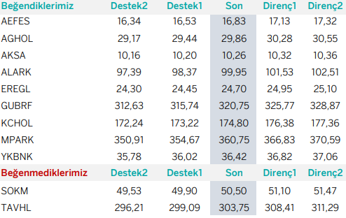 Günlük Bazda Yatırım Fikirleri’nde yer alan hisselerde günlük performans baz alındığından, yatırımcılar ilk aşamada %0.9-%2, ikinci aşamada %3.1-%4 aralıklarını pozisyon kapatma ve/veya kar alma seviyeleri olarak takip edebilirler.