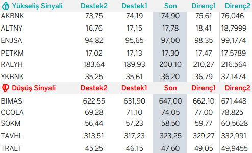 Günlük Bazda Yatırım Fikirleri’nde yer alan hisselerde günlük performans baz alındığından, yatırımcılar ilk aşamada %0.9-%2, ikinci aşamada %3.1-%4 aralıklarını pozisyon kapatma ve/veya kar alma seviyeleri olarak takip edebilirler.