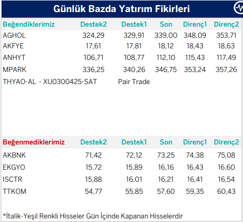 Günlük Bazda Yatırım Fikirleri’nde yer alan hisselerde günlük performans baz alındığından, yatırımcılar ilk aşamada %0.9-%2, ikinci aşamada %3.1-%4 aralıklarını pozisyon kapatma ve/veya kar alma seviyeleri olarak takip edebilirler.