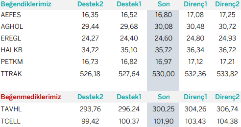 Günlük Bazda Yatırım Fikirleri’nde yer alan hisselerde günlük performans baz alındığından, yatırımcılar ilk aşamada %0.9-%2, ikinci aşamada %3.1-%4 aralıklarını pozisyon kapatma ve/veya kar alma seviyeleri olarak takip edebilirler.