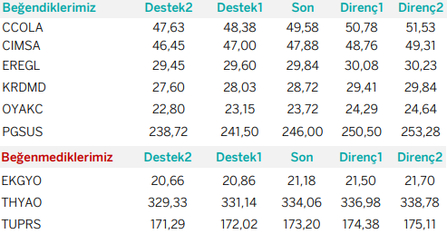 Günlük Bazda Yatırım Fikirleri’nde yer alan hisselerde günlük performans baz alındığından, yatırımcılar ilk aşamada %0.9-%2, ikinci aşamada %3.1-%4 aralıklarını pozisyon kapatma ve/veya kar alma seviyeleri olarak takip edebilirler.