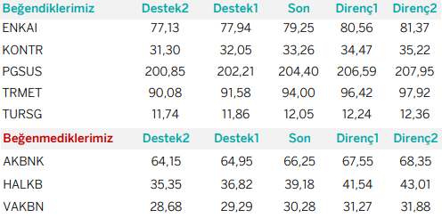 Günlük Bazda Yatırım Fikirleri’nde yer alan hisselerde günlük performans baz alındığından, yatırımcılar ilk aşamada %0.9-%2, ikinci aşamada %3.1-%4 aralıklarını pozisyon kapatma ve/veya kar alma seviyeleri olarak takip edebilirler.