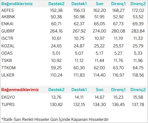 Günlük Bazda Yatırım Fikirleri’nde yer alan hisselerde günlük performans baz alındığından, yatırımcılar ilk aşamada %0.9-%2, ikinci aşamada %3.1-%4 aralıklarını pozisyon kapatma ve/veya kar alma seviyeleri olarak takip edebilirler.