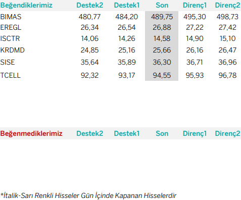 Günlük Bazda Yatırım Fikirleri’nde yer alan hisselerde günlük performans baz alındığından, yatırımcılar ilk aşamada %0.9-%2, ikinci aşamada %3.1-%4 aralıklarını pozisyon kapatma ve/veya kar alma seviyeleri olarak takip edebilirler.