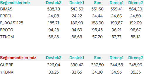 Günlük Bazda Yatırım Fikirleri’nde yer alan hisselerde günlük performans baz alındığından, yatırımcılar ilk aşamada %0.9-%2, ikinci aşamada %3.1-%4 aralıklarını pozisyon kapatma ve/veya kar alma seviyeleri olarak takip edebilirler.